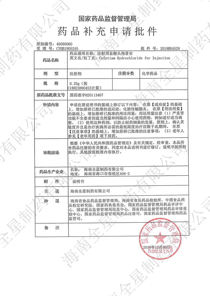 經過公司研發團隊長期循證醫學研究,并結合上市原研藥品使用說明書,我公司向國家藥品監督管理局提交的注射用奧美拉唑鈉注射用鹽酸頭孢替安4種規格)和注射用頭孢呋辛鈉3種規格)適應癥的補充申請近日獲得批準,新核準的藥品使用說明書拓展了臨時用藥范圍,用法用量描述更詳細更為安全,提供了更加嚴謹的用藥依據,有助于臨床醫生在一線工作中制定出更準確、更有效、更有針對性的治療方案。今后,公司將繼續提高研發力量,加強技術生產工藝,嚴把質量關口,為市場提供更多高品質、高標準的優質產品,為2030年健康夢中國夢添磚加瓦,獻上我司的一份努力。