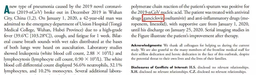 武漢同濟醫院專家在《Radiology》上發表的研究提到,1名42歲的患者在2020年1月1日住院,在此期間接受更昔洛韋、奧司他韋以及其他抗菌藥物治療,最終于2020年1月25日治愈出院。